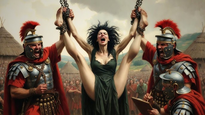 Era um teatro de humilhação cuidadosamente planejado, onde a soberania era reduzida a um troféu. Os elos pesados de ouro, a riqueza transformada em uma gaiola, arrastam-se ruidosamente contra as pedras. Este é o triunfo. Historiadores sugerem que o espetáculo servia a um propósito singular: despedaçar a imagem da Rainha antes que seu corpo pudesse ser tocado.