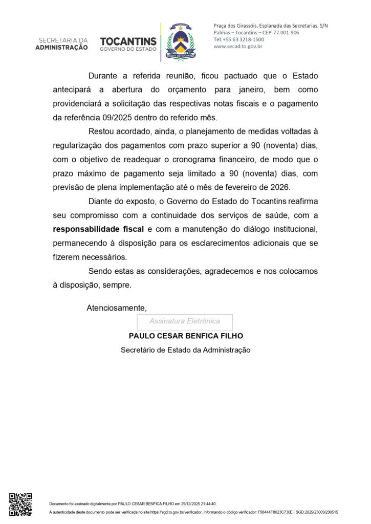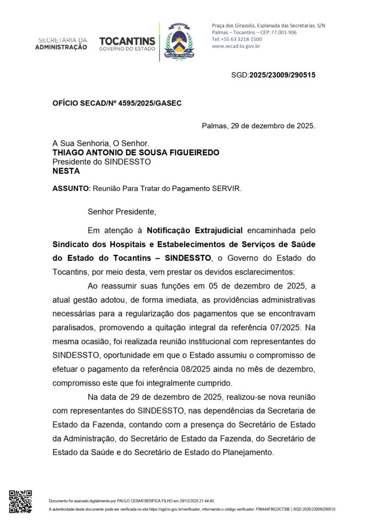 O Sindicato dos Hospitais e Estabelecimentos de Serviços de Saúde do Estado do Tocantins (Sindesto) informa que participou, no dia 29 de dezembro, de reunião com representantes do Governo do Estado para tratar da regularização dos pagamentos e da continuidade dos atendimentos prestados pelos hospitais.